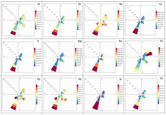 The pollution roses realized for the other analytes are reported in Supplementary Figure S2. The concentrations of all the analytes except Sb were particularly high when the wind prevalently blew from south southwest. Moreover, a source of Ca2+, Cl−, Cr, Fe, K+, Mg2+, Mo, Na+, Sb, SO42−, Ti, and V was present southeast, a source of Cl−, Fe, Mg2+, Na+, NO2, and Ti was present northeast.