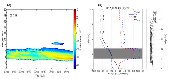 (a) Cloud vertical structures (CVS) derived from millimeter wavelength cloud radar (MMCR) at Beijing Nanjiao Weather Observatory (BNWO, 39.81° N, 116.47° E, 32 m above sea level) during 0700 to 0830 LST on 11 March 2017; (b) CVS from radiosonde sounding measurements at 0715 LST 11 March 2017.