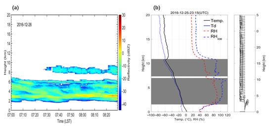 (a) Cloud vertical structures (CVS) derived from millimeter wavelength cloud radar (MMCR) at Beijing Nanjiao Weather Observatory (BNWO, 39.81° N, 116.47° E, 32 m above sea level) during 0700 to 0830 LST on 26 December 2016; (b) CVS from radiosonde sounding measurements at 0715 LST 26 December 2016.