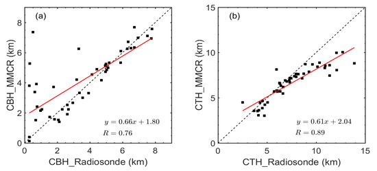 Scatterplots of cloud height observations from MMCR and radiosonde (a. cloud base height (CBH), b. cloud top height (CTH)). Note that the red line denotes the linear fitting curves. Also shown are the regression equation and correlation coefficient.