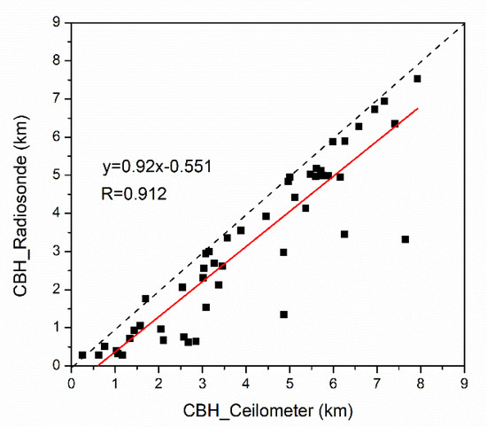 To make further comparisons, the CBHs retrieved from the ceilometer operated at the BNWO are also compared with those from the radiosonde soundings from December 2016 to March 2017. Overall, the CBHs derived by radiosonde are consistent with those derived by ceilometer, with a correlation coefficient greater than 0.9, as shown in Figure 4. The CBHs derived from radiosonde are generally lower than those from ceilometer, likely due to the differential detection capability of both instruments.
