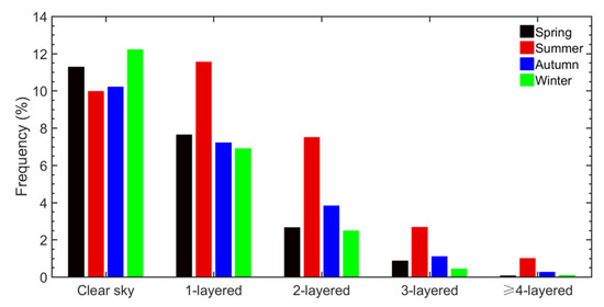 Occurrence frequencies of clear skies and one-layer, two-layer, three-layer, and four- or more-layer clouds at BNWO in four seasons during 2010–2017.