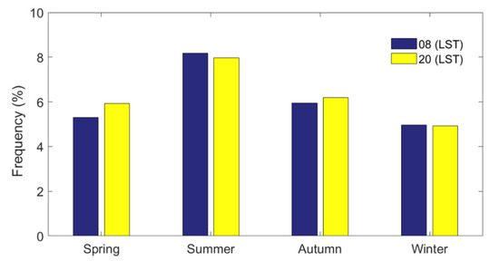 Based on the radiosonde observations at the BNWO from January 2010 to December 2017, the number of profiles that are identified as clear-sky, single-layer cloud and multilayer cloud from each season are calculated using the method described in Section 2.2, and the occurrence frequency (OF) of cloudy profiles or clear-sky profiles is defined as the ratio of the number of cases identified as cloudy or clear-sky to all the valid radiosonde launches, respectively. The OF of clear-sky, one-layer, two-layer, three-layer, and four- or more-layer clouds for four seasons is calculated as shown in Figure 5. In general, the OF of clouds in Beijing is slightly higher (~56.3%) than the OF of clear-sky clouds (~43.7%). From the aspect of seasonal variation, the total number of profiles taken during spring, summer, autumn, and winter are 1476, 2143, 1482, and 1449, respectively, among which the number of cloudy profiles in the four seasons are 737, 1490, 813, and 649, respectively. Cloudy profiles account for 11.3%, 22.7%, 12.4%, and 9.9% of the time with balloon launched in four seasons, respectively. Hence, the OF of clouds peaks in summer (~22.7%) and reaches a minimum in winter (~9.9%). Single-layer, two-layer, three-layer, and four- or more-layer clouds account for 33.3%, 16.5%, 5.1%, and 1.4% of all radiosonde launches, respectively, indicating that single-layer clouds are dominant in Beijing and that two-layer clouds are the main type of multilayer clouds. Although the frequency of multilayer clouds is lower than that of single-layer clouds, multilayer clouds play an important role in the study of radiation transmissions and cloud macroscopic characteristics. The OFs of single-layer (multilayer) clouds during spring, summer, autumn, and winter are 7.6%, 11.6%, 7.2%, and 6.9% (3.6%, 11.2%, 5.2%, and 3.0%), respectively. Both single-layer and multilayer clouds tend to appear more frequently in summer than in the other seasons, which is mainly related to warm and moist atmospheric conditions in summer. This is consistent with previous studies. Zhang et al. [46] found that the OF of multilayer clouds is higher during summer than during autumn over Shouxian. Peng et al. [49] reported that the frequency of occurrence of single-layer and multilayer clouds is highest in summer and lowest in winter in northern China based on observations from the cloud observing satellites CloudSat and Cloud Aerosol Lidar and Infrared Pathfinder Satellite Observations (CALIPSO). In terms of the occurrence frequencies of clouds at different times, the OF of cloud at 0800 LST and that at 2000 LST are nearly the same, as shown in Figure 6. The OF of cloud at 2000 LST is higher than that at 0800 LST in spring and autumn, while the situation is the opposite in summer and winter.