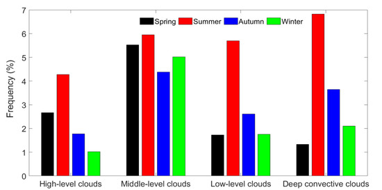 There are a series of effects of different cloud types residing at different altitudes on the earth radiation budget [50]. According to the method proposed by Zhang et al. [46], clouds have been classified into four groups based on the CBH and cloud thickness: (1) high-level clouds with bases greater than 5 km; (2) mid-level clouds with bases ranging from 2 to 5 km; (3) low-level clouds with bases lower than 2 km and thickness less than 6 km; and (4) deep convective clouds (DCCs) with a base at less than 2 km and thicknesses greater than 6 km. The occurrence frequencies of different cloud regimes in four seasons are calculated, and shown in Figure 7. These four types of clouds account for 9.7%, 20.9%, 11.8%, and 13.9% of all valid launches, respectively. The occurrence of mid-level cloud is more frequent than that of other cloud types in spring, autumn, and winter, demonstrating that mid-level clouds are dominant in Beijing, while the cloud frequency of DCCs is highest among the four cloud types in summer. This is mainly because Beijing is strongly affected by the East Asian Summer Monsoon that brings warm and moist air mass from the South China Sea and Northwestern Pacific Ocean, which is oftentimes linked to strong convective cloud and precipitation. Low-level (high-level) clouds account for approximately 1.7%, 5.7%, 2.6%, and 1.8% (2.7%, 4.3%, 1.8%, and 1.0%) of all valid launches during the spring, summer, autumn, and winter, respectively.