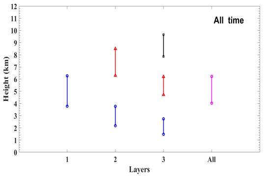 Figure 8 and Figure 9 show the mean vertical structure (cloud top height, cloud base height and cloud thickness) of one-layer, two-layer, three-layer, and all clouds during the whole period and different seasons, respectively. Overall, the average CTH and CBH of all the clouds in the Beijing area are 6.2 km and 4.0 km, respectively.