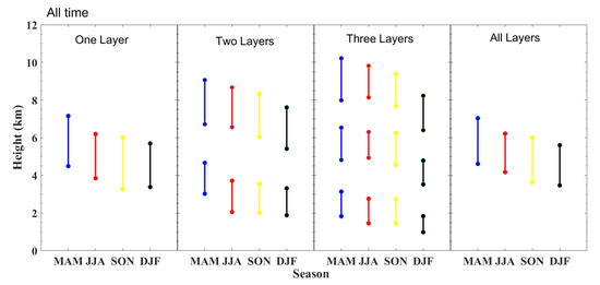 Mean vertical structures (cloud top height, cloud base height, and cloud thickness) of one-layer, two-layer, three-layer, and all clouds observed during different seasons.