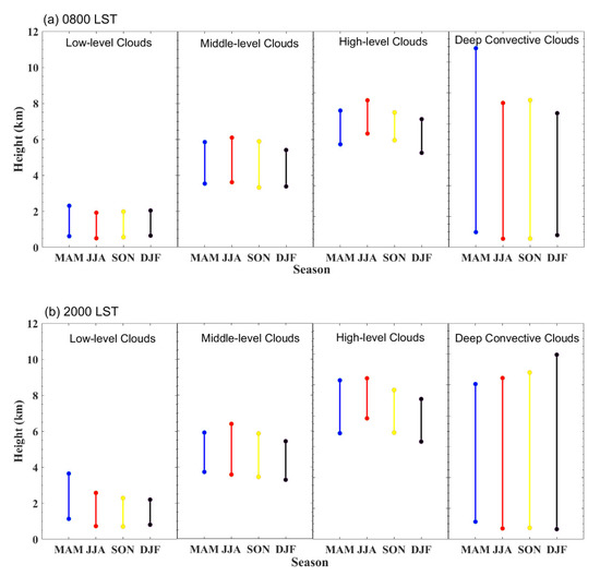Mean vertical structures (cloud top height, cloud base height and cloud thickness) of low-level, middle-level, high-level, and deep convective clouds observed during different seasons at 0800 LST (a) and 2000 LST (b).