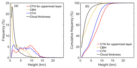 The occurrence frequency and cumulative frequency of the CBH, average CTH, CTH of the uppermost layer, and cloud thickness observed during the whole period in Beijing are shown in Figure 11a,b. The cloud top generally resides below an altitude of 16 km, and the occurrence frequency of clouds with top heights lower than 10 km reaches 80%. The peak of the average CTH (CTH for the uppermost layer) is observed at ~1.5 km (~9.5 km), with a frequency of 5.8% (6.1%). The CBH from radiosonde observations in Beijing is generally low. Clouds with base heights ranging from 0.5 to 1.5 km contribute approximately 43% of all the cloudy cases.