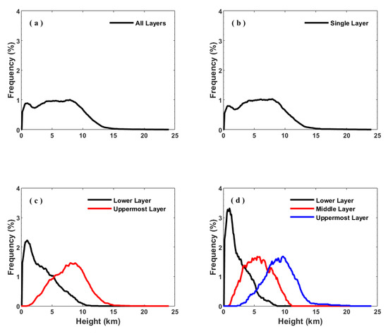 The cloud frequency as a function of height for single-layer clouds, two-layer clouds, three-layer clouds, and all clouds are calculated and shown in Figure 12. The occurrence frequencies of all clouds and single-layer clouds show a bimodal distribution, with the first peak observed at ~1 km and the second peak observed between 6 and 7 km of altitude. Most of the clouds reside at altitudes of 1 to 9 km. The occurrence frequencies of the mid-layer and upmost layer of two-layer clouds and three-layer clouds have distributions close to the normal distribution. For two-layer cloud systems, the lower layers are concentrated at altitudes below 5.5 km at a frequency of 80%, and the cloud frequency tends to decrease sharply with height after reaching the maximum at ~1 km. Comparatively, the uppermost cloud layers appear over a wide height range of 1–14 km with the peak frequency centered at 8 km. The frequency of the uppermost, middle, and lower layers of the three-layer cloud peaks at 1 km, 5.5 km, and 9.7 km, respectively. Most of the uppermost (middle) layer clouds are located at altitudes between 3 and 14 km (2 and 11 km), while the lower layer clouds are concentrated at altitudes below 3.9 km. This conclusion is generally consistent with the results given by Wang et al. [54], who analyzed the cloud frequency in northern China using CloudSat data, where the frequencies of single-layer clouds and multilayer clouds are also normally distributed, whereas the altitude at which the cloud frequency reaches its peak is slightly higher than the results in this paper.