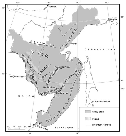The study area is a vast region at the southern part of the Russian Far East, extending from longitude 127 to 143° E and from latitude 43 to 59° N. The topography is varied; it includes extensive mountainous regions stretching mainly from south-west to north-east, namely Mountains Malyi Khingan, Sikhote-Alin, Dzugdzur, Bureyan Upland and other low and middle mountains, with a maximum of 2078 m above sea level, and wide plains in the Amur River valley, namely Zeya-Bureyan Plain, Amur-Zeya Plain, Middle Amur Plain, and Low-Amur Depression (Figure 1).