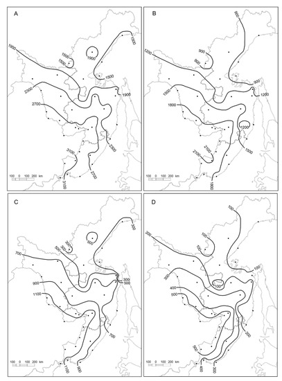 Growing degree days (GDD) in the Russian Far East for period 1966–2017 for four thresholds: (A) GDD0, (B) GDD5, (C) GDD10, and (D) GDD15.