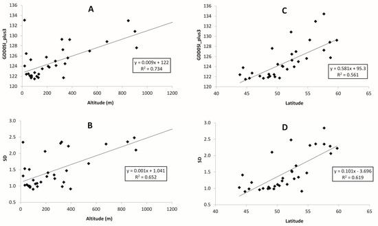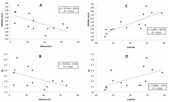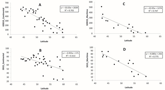 Both GDDs and standard deviations depend on the latitude of the location, and this dependence is apparent for all temperature thresholds. As an example, we show the plots for GDD15 and corresponding values of SD. Figure 4 demonstrates the relationship between GDD15 and its SD with latitude: the further to the north, the lower the GDD15, with SD showing results for the continental weather stations (Figure 4A,B) and for maritime locations (Figure 4C,D). The response of both GDD15 and its SD on latitude is more evident for the coastal weather stations.