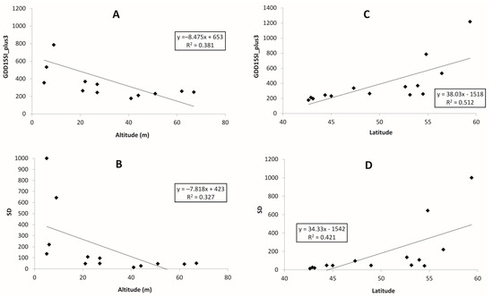 Dependence of Sensitivity Index for growing degree days with 15 °C threshold (GDD15SI) and its standard deviation (SD) for a GDD15+3 scenario on altitude and latitude for maritime locations in the Russian Far East for the period 1966–2017: (A,B) altitude (m), (C,D) latitude.