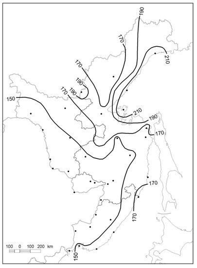As the study region stretches along the coast of the Pacific Ocean from south to north, it has from Warm Summer Continental to Subarctic Continental Climates, according to the Köppen-Geiger climatic classification [83,84]. An extreme continental annual temperature regime typifies the climate of the area. The annual temperature norm (1961–1990) varies between –5.4 °C at Ekimchan to 5.7 °C at Pogranichnyi, and the annual temperature ranges change from 28.2 °C over the coastal zone to 52.7 °C in the continental interior [44].