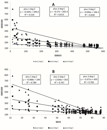 Relationship between growing degree days with 15 °C threshold (GDD15), its standard deviation (SD15) and Sensitivity Index (GDD15SI) for locations in the Russian Far East for the period 1966–2017 for +1, +2 and +3 °C warming scenarios: (A) for GDD15, (B) for SD15.