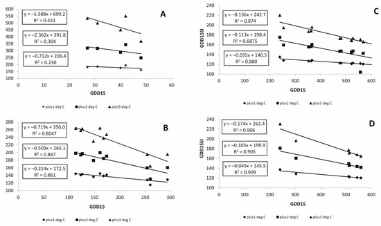 Relationship between growing degree days with 15 °C threshold (GDD15) and Sensitivity Index (GDD15SI) depending on its standard deviation (SD15) for locations in the Russian Far East for the period 1966–2017 for +1, +2 and +3 °C warming scenarios: (A) for SD15 near 25, (B) for SD15 near 55, (C) for SD15 near 75, (D) for SD15 near 85.