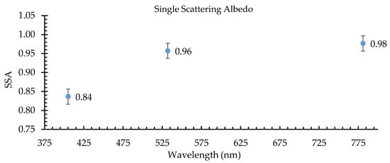 The SSA, shown in Figure 2, was the average ratio of the scattering coefficient to the extinction coefficient for the first 5 min of 12 burns. At the 405 nm wavelength, the SSA of cheatgrass combustion aerosols was the lowest (0.81–0.85); here, a significant part of the extinction (i.e., 15%–19%) was due to absorption. The SSA at 405 nm had the least variation between the burns; it was indicative of the absorption of BrC, which was highly absorbing in the UV. The SSA at the 532 nm and 781 nm wavelengths indicated some absorption from BC, which is highly absorbing in the visible spectrum []. Lewis et al. [] reported the optical properties of rice straw, a fuel similar to cheatgrass. The SSA for the 405 nm wavelength for cheatgrass was reported here to be 0.83 ± (0.02), showing similar absorption as the rice straw with an SSA of 0.88 with an error of 5% reported by Lewis et al. [].