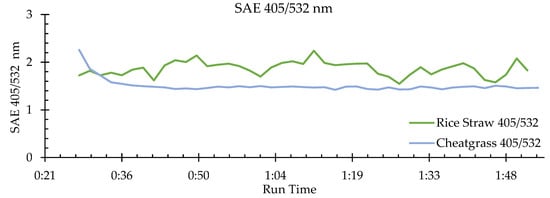While there has been little work on SSA, AAE, and SAE of aerosols emitted from the open combustion of grasses, Lewis et al. [] reported SSA, AAE, and SAE values for aerosols emitted from the combustion of rice straw (Table 2). The AAE 405/781 nm range observed by us for cheatgrass emissions (2.0–6.9) for the wavelength pair of 405/870 included the AAE 405/870 nm value of 2.8 that was reported by Lewis et al. [] for rice straw emissions. Their SAE (405/532 nm) values (1.7–2.2) measured for rice straw combustion emissions were also well within the wider range (0.5–3.5) observed by us for cheatgrass combustion emissions. SSA measured by them at 405 nm for rice straw combustion emissions was 0.88, while our result for 405 nm SSA of cheatgrass combustion emissions was quite similar (i.e., SSA = 0.083 ± 0.02). Figure 3 is a plot of the SAE 405/532 nm values found in this study along with rice straw SAE 405/532 nm derived from Figure 4 of Lewis et al. [], showing that the rice straw SAE was generally higher, more variable, and without a monotonic decrease when compared to our measurements for cheatgrass, likely due to combustion conditions and fuel properties. At the beginning of our cheatgrass burn (see Figure 3), the SAE was quite high (i.e., 2.26), indicating the predominant emission of fine mode particles. As the burn evolved, the SAE of cheatgrass decreased, indicating an increase of particle sizes with a shift to a mixture of fine and medium mode particles.