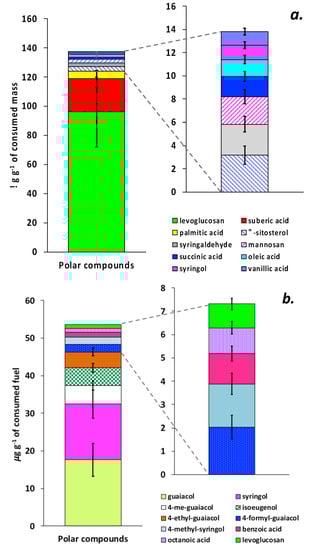 Sampling and analysis of organic emissions collected on XAD (gas-phase organic compounds) resin (Sigma-Aldrich, St. Louis, MO, USA) and filter samplers (particle-phase organic compounds) are described in detail by Sengupta et al. [] and Samburova et al. []. Briefly, combustion emissions were collected on 100-mm diameter Teflon-impregnated glass fiber (TIGF) filters (Fiber Film T60A20, Pall Life Sciences, Ann Arbor, MI, USA), followed by a XAD-4 cartridge at a flow rate of 0.11 m3/min. Immediately after sampling, the samples were stored at –20 °C. Prior to extraction, collected filters and XAD cartridges were spiked with deuterated internal standards of polar organic compounds []. The samples were extracted with an accelerated solvent extractor (ASE) system (DIONEX, ASE-300, Salt Lake City, UT, USA) at the following conditions: temperature: 80 °C, solvents: dichloromethane (150 mL) followed by acetone (150 mL), extraction cell pressure: 10.3 MPa, extraction time: 15 min. After the extraction, the samples were pre-concentrated to 1 mL using a rotary evaporator at 35 °C and a gentle vacuum. The extracts were derivatized with N,O-Bis(trimethylsilyl)trifluoroacetamide (BSTFA) agent, as described elsewhere [], and analyzed with gas chromatography-mass spectrometry (GC-MS) method [] using Varian CP-3800 GC equipped with a CP-8400 autosampler and interfaced to a Varian 4000 Ion Trap Mass Spectrometer (Varian, Inc. Walnut Creek, CA, USA). Injections were performed into a 30 m length, 5% phenylmethylsilicone fused silica capillary column (DB-5MS, Agilent Technologies, Palo Alto, CA, USA) with an integrated deactivated guard column (length: 10 m).