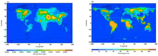 The surface distribution plot depicting the surface level (a) mixing ratios of PFOA in ppt simulated by STOCH-DE; (b) percentage of PFOA removed as a result of its reaction with stable Criegee intermediates (SCIs) simulated by STOCH-CI.