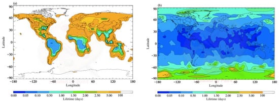 Despite clear concentration peaks of Criegee intermediates over the tropics, a plot of the atmospheric lifetime of PFOA with respect to SCI-mediated loss shows significant contributions over all landmasses (see Figure 2a). Of course, the shortest atmospheric lifetimes are indeed located over areas experiencing peaks in SCI concentrations (with a minimum modelled lifetime of ≈7 min over the state of Roraima in Brazil). However, in general, the lifetime upper-limit over landmasses is ≈2.5 days (in reasonable agreement with SCI-mediated lifetimes reported in the literature) [23]. Further comparison of this result with the literature indicates that a significantly shorter lifetime of PFOA is facilitated by reaction with SCIs than that facilitated by deposition (the route generally accepted as PFOA’s primary loss process from the atmosphere) over all landmass.