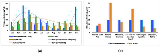 (a) A histogram showing a comparison between the measurement data collected by Harada et. al. [55] (reduced to 50% to account for the pollution of the measured environment) and model outputs for the “STOCH-CI” and “STOCH-HPE” simulations. Third -order polynomial trend lines have been imposed on each dataset to allow for an arbitrary comparison of seasonality. (b) A histogram showing a comparison between the measurement data collected from Rauert et al. [56] and model outputs for the “STOCH-HPE” simulation. For all sites, excluding Costa Rica, PFOA was not detected above the method detection limit (15 pg m−3).