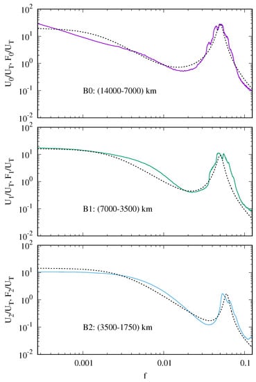 Upper panel: the spectra (purple line) and (dashed line); middle panel: the spectra (green line) and (dashed line); lower panel: the spectra (light blue line) and (dashed line). Each spectra is divided by the integrated energy and is plotted as a function of the normalized frequency f.