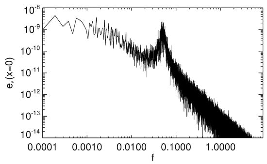 The kinetic energy imposed at the boundaries through the forcing velocity displays the same features as observed in the data of the photospheric velocity (input of the system). In particular, a bump centered at frequency , corresponding to (300 s), is reproduced in the frequency spectrum (see Figure 2). Correspondingly, the system responds by forming energy spectra with peculiar characteristics (see Figure 6 and Figure 7): a well-defined spike is present both in kinetic and magnetic spectra, centered at the fundamental resonant frequency , i.e., inverse of the Alfvén crossing time , as well as subsequent spikes corresponding to the higher harmonics, at frequencies multiples of the fundamental one (). Resonant modes are standing Alfvénic fluctuations which are excited by the broad-band spectrum of the boundary velocity [,]. All these spikes are very sharp and slender. The resonance phenomenon is related to partial reflection of fluctuations taking place at both boundaries and . Of course, since the net incoming flux P takes both positive and negative signs in time (Figure 3), the reflection is not total, otherwise no energy could enter or leave the spatial domain.