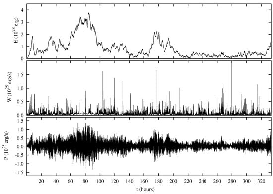 In consequence of intermittency—a peculiar feature of this system []—the dissipated power W displays abrupt bursts during the time (Figure 3) which are a signature of the fragmentation of dissipative structures taking place at small scales. The average value of the dissipated power is erg/s. Bursts of W can be identified as energy release events taking place in the solar corona. Indeed, it has been shown that some statistical properties of dissipative events in the hybrid shell model, namely, the distributions of peak intensity, duration time, released energy and waiting times between subsequent events, positively compare with the same distributions found for coronal energy release events [].