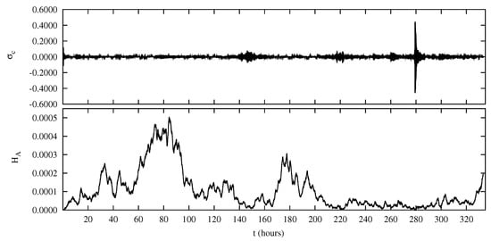 The squared magnetic potential, defined as , is plotted as a function of time in the lower panel of Figure 4. Comparing with the total energy plotted in Figure 3 we see that H and E have a very similar time behaviour. This is again due to the dominance of large-scale magnetic fluctuations in determining E and to the fact that the major contribution to H comes from magnetic fluctuations at low values. We notice that both cross-helicity and squared magnetic potential H are ideal invariants of 2D shell models, i.e., they are exactly conserved by nonlinear terms in Equation (3). However, in the hybrid shell model H and are not conserved, both because of the driving imposed at boundaries and , and in consequence of dissipation.