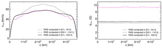 The RMS velocity (left panel) and magnetic field (right panel) fluctuations are plotted as functions of x for the whole simulation time (black solid lines), for the interval h (grey dot-dashed lines) and for the interval 58 h h (magenta dashed lines).