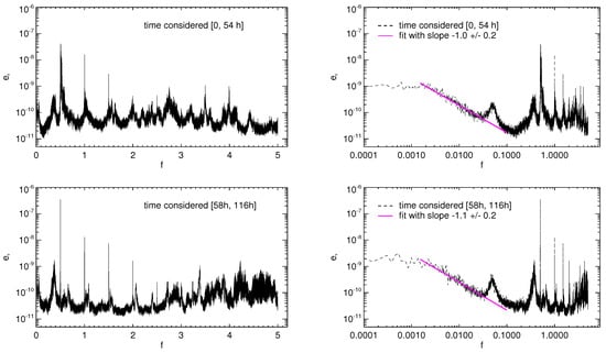 A relevant feature of kinetic and magnetic frequency spectra is the existence of power-law ranges at low frequencies. Considering the kinetic spectrum, we find a power law dependence in the interval of frequencies , corresponding to Hz Hz, in physical units. A fitting procedure gives a spectral index when the spectrum is calculated in the time interval h, 54 h]. The index value slightly increases in absolute value when the time series considered for computing the spectrum is in the interval h, 116 h], though this variation remains within the error bar. The existence of a power-law ranges in spectra of velocity measured in corona has been pointed out by [,,], in the frequency range Hz Hz. The spectral index varies according to the considered region within the corona, but it is around in quiet-Sun regions []. Therefore, the power-law range found in our result is in good accordance with measures of velocity fluctuations in quiet-Sun regions.