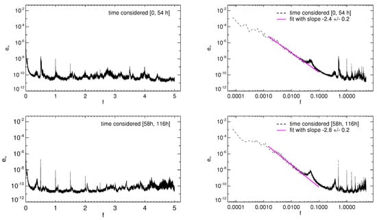 The kinetic spectra (black lines) vs. frequency display resonance spikes and peaks, clearly detectable both in semi-log scale (left panels) and log scale (right panels), as well as a power-law range at low frequencies (the magenta line indicate a fitting in the frequency interval ). The kinetic energy spectrum does not seem to significantly change when computed at diverse time intervals: 0 54 h (upper panels) and 58 h 116 h (lower panels)).