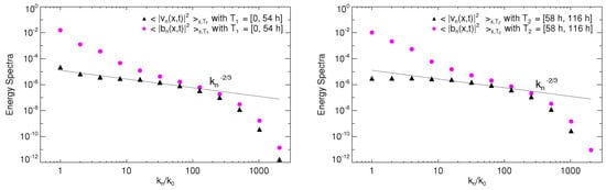 The kinetic and magnetic energy spectrum vs. the transverse wavenumber (black triangles and magenta circles, respectively) computed by making the time average in = [0, 54 h] (left panel) and = [58 h, 116 h] (right panel). A function proportional to is plotted for comparison (full line). Even though the energy values are depicted in the logarithmic scale, the increase of the magnetic energy in is appreciable compared to the values reached in . Kinetic energy has the opposite trend in these two periods.