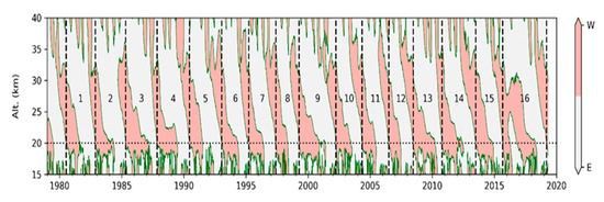 In this section, we discuss the wave period variability during different QBO cycles. The beginning of a QBO cycle is defined as the time when the westerly wind shear (meaning the boundary at which the zonal wind reverses from easterly to westerly) appears at a 20 km altitude, and the end of a QBO cycle is the time when the next westerly shear appears at the same 20 km altitude, i.e., the beginning of the next QBO cycle. Figure 1 illustrates the direction of the zonal wind varying with altitude and time over the equatorial region (±10° latitude, as defined in Section 2). Sixteen QBO cycles were counted according to our definition. At the beginning of each QBO cycle, the westerly regime is thickest, with an average thickness of 13 km. Meanwhile, the wind reverses to easterly above the westerly regime in the upper stratosphere. The westerly shear remains at an altitude slightly higher than the tropopause, but the easterly shear keeps descending as time goes on, resulting in the thinness of the westerly regime during the early stage of the QBO. Then, the new westerly regime forms in the upper stratosphere at the middle stage of QBO, and soon the new westerly shear and the new easterly shear that appears right after the westerly start to descend, further ushering in the next QBO cycle while the new westerly shear arrives at a 20 km altitude. The westerly regime is found to occupy much less time than the easterly regime during a QBO cycle. Especially at the middle stage, the zonal wind is almost easterly in the whole stratosphere.