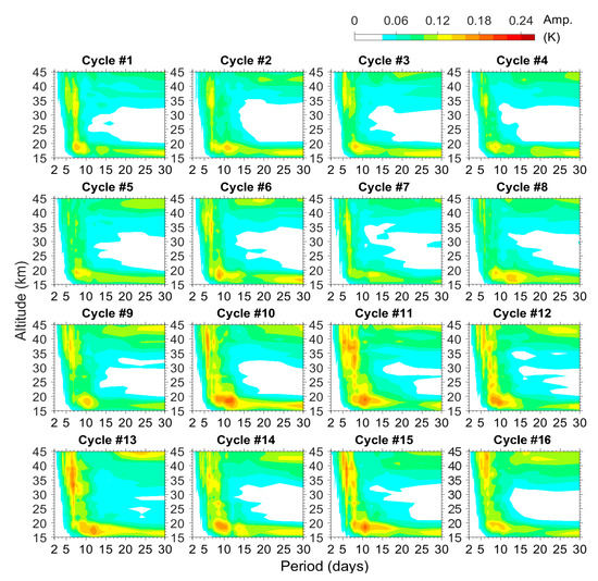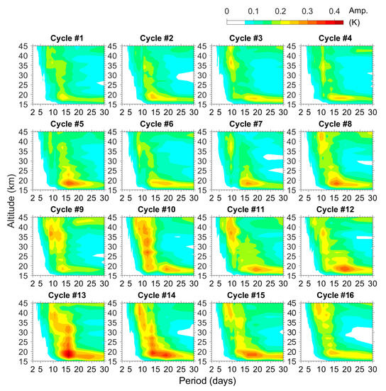 In addition, the amplitude of E1 waves seems to intensify as time goes on. We calculated the altitude-period-averaged amplitude, i.e., the average amplitude of all spectral grids of each plot in Figure 2. We found a significant difference between the former seven (#1–7) and the latter nine (#8–16) cycles. The average amplitudes in the former cycles and the latter cycles were 0.077 K and 0.094 K, respectively. These average values were quite small because all the altitudes and periods were included in calculating the average amplitude. However, it gained 21% during the 16 QBO cycles, and the increment mainly occurred starting from Cycle #8. If we focus on the slow E1 waves, the average amplitude further gained 24% from 0.146 K to 0.181 K, but in contrast, the ultra-fast E1 waves gained only 11% from 0.027 K to 0.030 K during the same epoch. Please note that the results we discuss here are regarding the long-term trend of E1 amplitudes. Cycle-to-cycle (short-term) variations are sometimes evident, and this makes the average amplitude of slow E1 waves in Cycle #5 almost the same as that of Cycle #16.