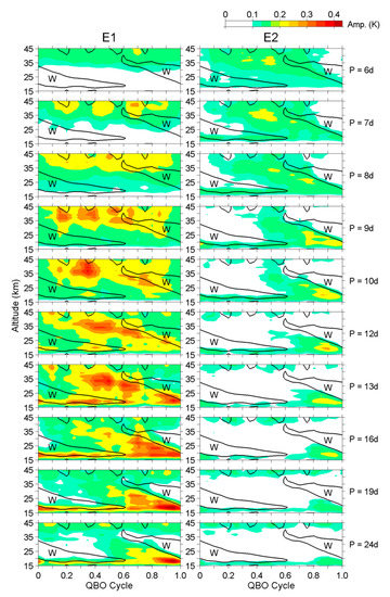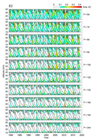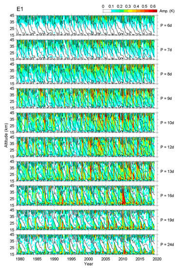 Since the information during a QBO cycle (~2–3 years) is all mixed, some details cannot be revealed in Figure 2. To better understand the variations in amplitude and the discrepancies in the dominant periods between different QBO cycles, the altitudinal variation in daily E1 amplitudes at some selected periods was extracted and further plotted in Figure 3; larger versions of each panel are provided in the Supplementary Materials (Figures S1–S10) of this paper. The ultra-fast E1 waves are not shown here because their amplitude was negligible. The background zero-wind (shear) line is plotted in each plot as well. In general, the fast E1 waves with 6–8 day periods tended to appear in the upper stratosphere, and they were not restrained by either easterly or westerly regimes of the zonal wind. In contrast, the slow E1 waves with ≧16 day periods were very active below the altitude of westerly shears and inactive inside the westerly regimes. For those E1 waves with a medium period of between 8 and 16 days, they were evident in the whole stratosphere, and were usually (but not always) not restrained by the phase of the zonal wind. We also noticed that the 24-day E1 wave seemed to have a maximum amplitude of about 0.2–0.3 K that varied from cycle to cycle, as can be seen in Figure 2; actually, its peak amplitude could exceed 0.6 K during some short epochs, as shown in Figure 3. This discrepancy occurred because Figure 2 shows the spectral amplitudes during the full QBO cycle and illustrates the average contribution at different wave periods during the QBO cycle. The amplitude is thus smaller than that in Figure 3, since the 24-day E1 wave was absent in the westerly regimes.