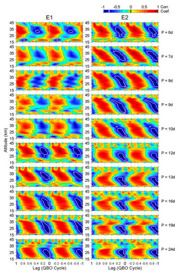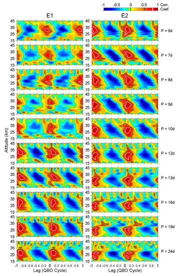 Figure 6 demonstrates the intra-cycle variations of E1 and E2 waves. However, this is just a fundamental qualitative analysis that reveals how the easterly environment affects wave activity and how those waves appear at different QBO stages sequentially. To find the detailed relationship between the zonal wind and E1/E2 waves, the average values of the 16 QBO cycles were used again to calculate the linear cross-correlation coefficients between the zonal wind and wave amplitudes. A lag (phase difference), defined as the time that the wave amplitude was behind the zonal wind (i.e., the response time of the wave amplitude after the zonal wind has changed), was considered, since the variation in the two parameters may have been out of phase. Figure 7 displays the correlation coefficients at different wave periods within the lag of ±1 QBO cycle, though the zonal wind and the wave amplitude are quasi-sinusoidal functions, and their correlation coefficient repeats the same values every 1 QBO cycle in lag. Note that the transverse axis (lag) in each panel is reversed (value increases from right to left), so that the tilted structures (regions circled by white lines) are similar to the descending phase of the QBO, as shown in the previous figures. Besides this, the zonal wind, i.e., the U-component of the wind, is alternately a positive or negative value by its original definition, but the wave amplitude is always a positive value. These two parameters should be negatively correlated, as the E1/E2 waves are favored by the easterly wind (negative U), as found in Figure 6. The positive correlation is just a conjugate of the negative correlation with a ±0.5 QBO cycle difference in lag. Therefore, we mainly focus on the high negative correlation parts in Figure 7.