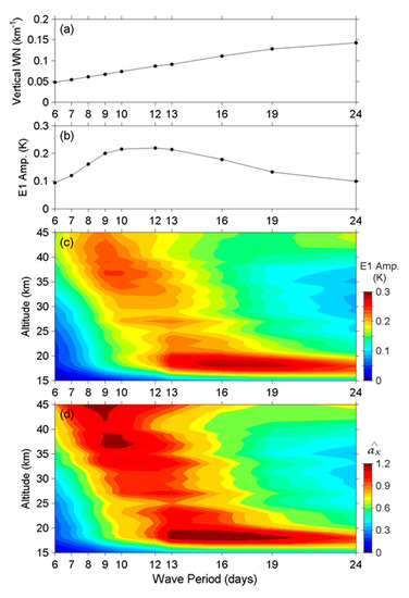Here we used the 6-day and 12-day E1 waves at a 30 km altitude as examples to illustrate Equation (1) because both waves showed a high correlation at this altitude in Figure 8. The horizontal wavenumber is a constant for all E1 waves. The vertical wavelength can be obtained from the phase profiles of the 2D-FFT results and the average values are shown in Figure 9a. The vertical wavenumbers of the 6-day and 12-day E1 waves are about 0.048 and 0.087 km−1, respectively. is a constant and is about 6.6 km at a 30 km altitude. Substituting these values into Equation (1), we found that the term in the square brackets at 6-day and 12-day periods had a ratio of 0.91 and that the 6-day one is smaller than the 12-day one. On the other hand, the zonal wind velocity perturbation, , was composed of terms with many wave periods and was considered to be linearly proportional to the temperature fluctuation (i.e., the wave amplitude in the present study) for each wave period, due to the linearity between the kinetic and the potential terms of atmospheric gravity waves [40,41]. Figure 9b shows the E1 amplitudes at a 30 km altitude. The amplitude of the 6-day E1 wave was much smaller than that of the 12-day E1 wave, with a ratio of 0.43. Finally, from Equation (1), we estimated that the acceleration of the E1 waves with a 6-day period was only about 39% (=0.91 × 0.43) of those with a 12-day period. Figure 9c further plots how the E1 amplitudes vary with period and altitude, and Figure 9d is the normalized zonal acceleration (, the value for a 12-day period at 30 km is normalized to 1), calculated by substituting values in Figure 9a,c into Equation (1). From the figure, it is obvious that the acceleration of the fast E1 waves is rather small and can be negligible, especially in the middle and lower stratosphere. The result is in agreement with our earlier assumption.