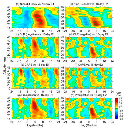 Lastly, we analyzed the shape of the contour plots in Figure 10 and Figure 11. The amplitude contour plots of the 16-day E1 and E2 waves both show a triangular shape (Figure 10) because these waves can propagate upward while the easterly shear descends to the lower stratosphere but are confined below the westerly regime, and therefore the active range in altitude becomes narrow as time goes on. In Figure 11, both the OLR (Figure 11c) and the precipitation (Figure 11g) contour plots for the 16-day E1 wave show the triangular shape (the positive correlation region centered at zero lag) as similar to the amplitude in Figure 10. For the 16-day E2 wave, the OLR and precipitation contour plots look like a trapezoid but not a triangle. Nevertheless, the descending structure is still recognizable, and the lag increases as the altitude decreases. The contour plot for the CAPE (Figure 11f) shows a triangular shape at 2–12 months lag that is similar to the 16-day E2 wave in Figure 10; unfortunately, its correlation coefficient was smallest and we already eliminated it through the competition. The final result, based on all three competition principles, was that precipitation was the most crucial convective index in representing the activities of E1 and E2 waves, though the investigation was only a case study based on the 8-year data from 2006 to 2013. Even though the Niño 3.4 index was defeated in the competition, we still paid some attention to the Niño 3.4 index as well as the zonal wind, because the former one can foresee the dramatic increase in precipitation (Figure 10, 2 months of leading time in this case) and the latter one interacts with waves, further controlling wave amplitudes in the stratosphere.