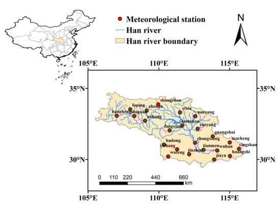 The Han River is the longest tributary of the Yangtze River, located at an important climate transition zone in China; this tributary is extremely sensitive and fragile to global climate change. As the main grain-yielding and most important point of economic transmission in the central and western regions of China, the economic development of the Han River Basin (HRB) occupies an important position in the Yangtze River Basin and for the whole country. Moreover, the HRB is the most important source of water for the Middle Route Project of the South-to-North Water Transfer Project in China, which directly supports the production and livelihoods of 438 million people [].