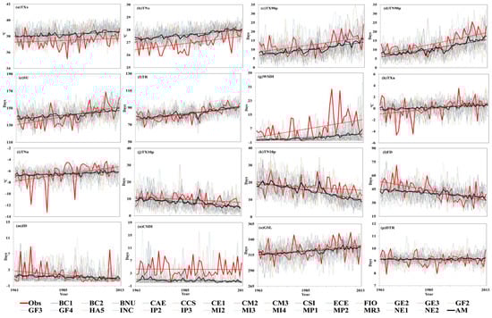 Time series of the observed values (red line) and 28 Global Climate Models (GCM) simulations, including the multi-model average mean (AM, black line) extreme temperature indices during 1961 to 2013 across the Han River Basin.