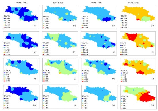 The spatial distribution of changes in the multi-model ensemble for the four intensity-based extreme indices (TXx, a–d; TNx, e–h; TXn, i–l; TNn m–p) during the 2040s and 2080s under two scenarios relative to 1971–2010 across the Han River Basin.