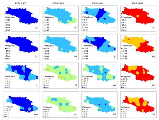The spatial distribution of changes in the multi-model ensemble for the four percentile-based indices (TX90p, a–d; TN90p, e–h; TN10p, i–l; TX10p m–p)during the 2040s and 2080s under two scenarios relative to 1971–2010 across the Han River Basin.