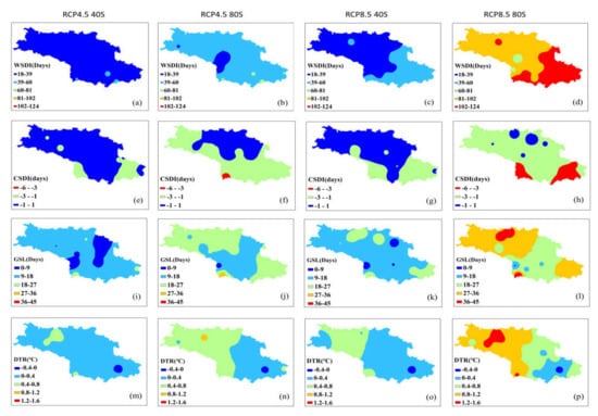 The spatial distribution of changes in the multi-model ensemble for the four spell duration indices (WSDI, a–d; CSDI, e–h; GSL, i–l; DTR m–p) during the 2040s and 2080s under two scenarios relative to 1971–2010 across the Han River Basin.