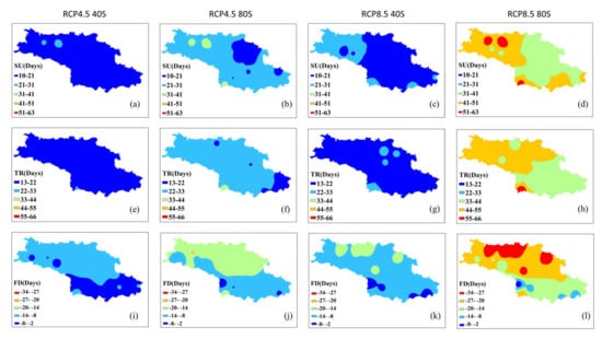 Another significant type of warming in the HRB is reflected by the four fixed threshold-based indices (Figure 6a–p). There is an obvious upward trend for SU and TR over the whole basin, while the annual FD gradually decreases in the north. SU and TR both increase by 2.3 d/decade (p < 0.01) and 5.8 d/decade (p < 0.01) for RCP4.5 and RCP8.5, respectively. However, the previously rapid increase slowed and maintained a high range from 2021 to 2100. The obvious increases over time were mainly distributed to the north of the HRB.