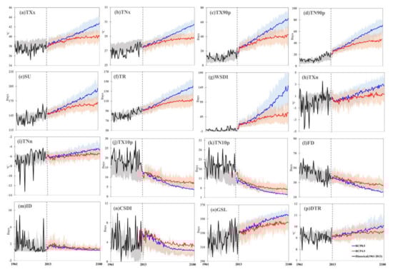 Time series (1961–2100) of the multi-model ensemble simulated extreme temperature indices (a, TXx; b, TNx; c, TX90p; d, TN90p; e, SU; f, TR; g, WSDI; h, TXn; i, TNn; j, TX10p; k, TN10p; l, FD; m, ID; n, CSDI; o, GSL; p, DTR) under RCP 4.5 and RCP 8.5 averaged across the HRB. The top and bottom bounds of the shaded area are the 90th and 10th percentile of the annual values, respectively, for the 28 GCM simulation changes in the temperature indices.