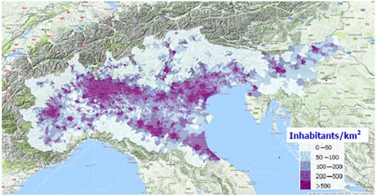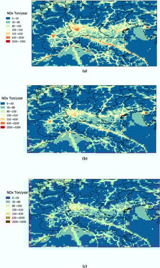 The purpose of these three scenarios is to evaluate the effectiveness of the emission reduction measures to achieve compliance with the Air Quality Directive limit values for PM10 and NO2 []. The limit values considered are the annual average of PM10 (less than 40 μg/m3), the daily value of PM10, i.e., the average concentration of 24 h (no more than 35 days per year which exceed the 24 h average concentration of 50 μg/m3) and the annual average of NO2 (less than 40 μg/m3). These limit values are not achieved in most of the Po Valley.