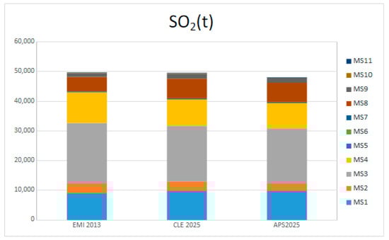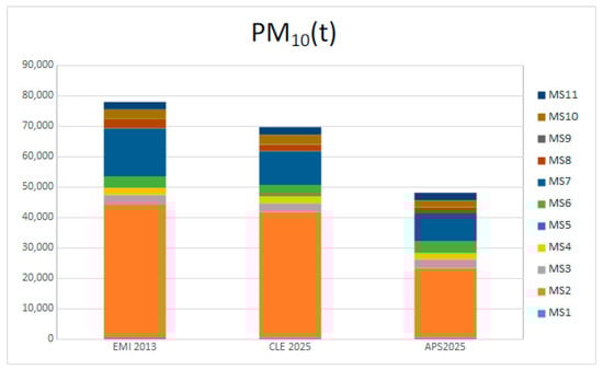 The emissions scenario related to the implementation of the current legislation in the year 2025 is called CLE2025. The emission reduction for CLE2025 has been estimated by the application of emission projections provided, for each Italian region, by the Greenhouse Gas and Air Pollution Interactions and Synergies (GAINS)-Italian national model [] managed by National Agency for new Technologies Energy and Sustainable Economic Development (ENEA). Starting from the baseline scenario, projections are calculated by a time proxy obtained from GAINS trends. The time projections are calculated for each sector and activity and remapped to Standard Nomenclature for Air Pollution (SNAP) and fuel categories. The methodology is described in detail in the PREPAIR report [].