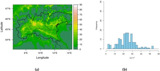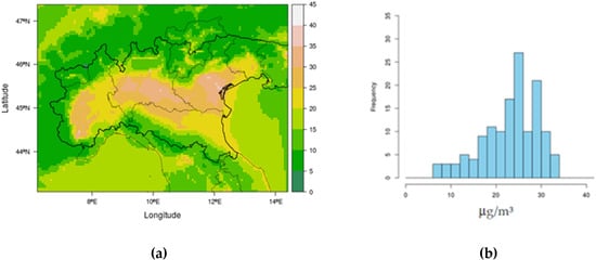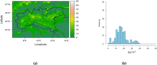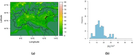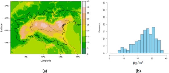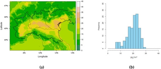 Baseline PM10: (a) ground field of annual average concentration (μg/m3); (b) frequency distribution of annual average concentration in background stations.
